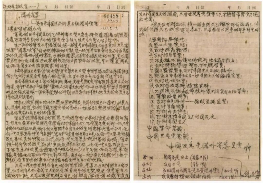 事變爆發次日(9月19日),滿洲省委果敢行動,在沈陽街頭四處張貼《中共滿洲省委為日本帝國主義武裝占領滿洲宣言》、(即“9·19宣言”),號召并組織廣大人民群眾奮起抵抗日本侵略。作為中國第一份抗日文告,這份宣言旗幟鮮明地揭露了日本帝國主義的侵略本質,痛斥了不抵抗政策的嚴重危害,并發出武裝抗日的戰斗號令,成為抗戰起點的重要標志。