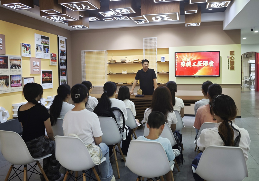 活動以參觀勞模工匠展廳為開篇,通過一件件鐫刻時光的展品、一段段感人至深的奮斗故事,開啟了一場跨越時空的精神對話,讓同學們在沉浸式體驗中感悟“平凡何以成就非凡”的勵志故事。勞模工匠課堂還特邀鹿寨黃氏木雕“非遺”技藝傳承人、“鹿寨工匠”黃成非,現場為大家講解他在學習、從事木雕工藝創作20多年里對于工匠精神的理解,并展示普通木料經雕刻從原始到藝術的蛻變,為同學們提供了寶貴的啟示和指導,鼓勵同學們用扎實的專業功底和創新思維為未來蓄力。
