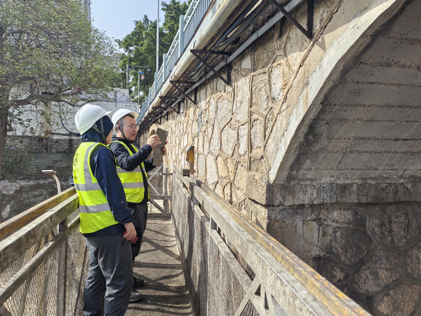 工作人員在進行外觀檢測和橋梁病害記錄(黃英?攝)