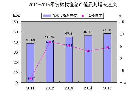 全縣農林牧漁業總產值48.31億元,增長4.31%。其中:農業總產值27.52億元,增長5.16%;林業總產值4.52億元,增長4.05%;牧業總產值13.72億元,增長2.55%;漁業總產值1.15億元,增長7.81%;農林牧漁業服務業總產值1.41億元,增長4.44%。