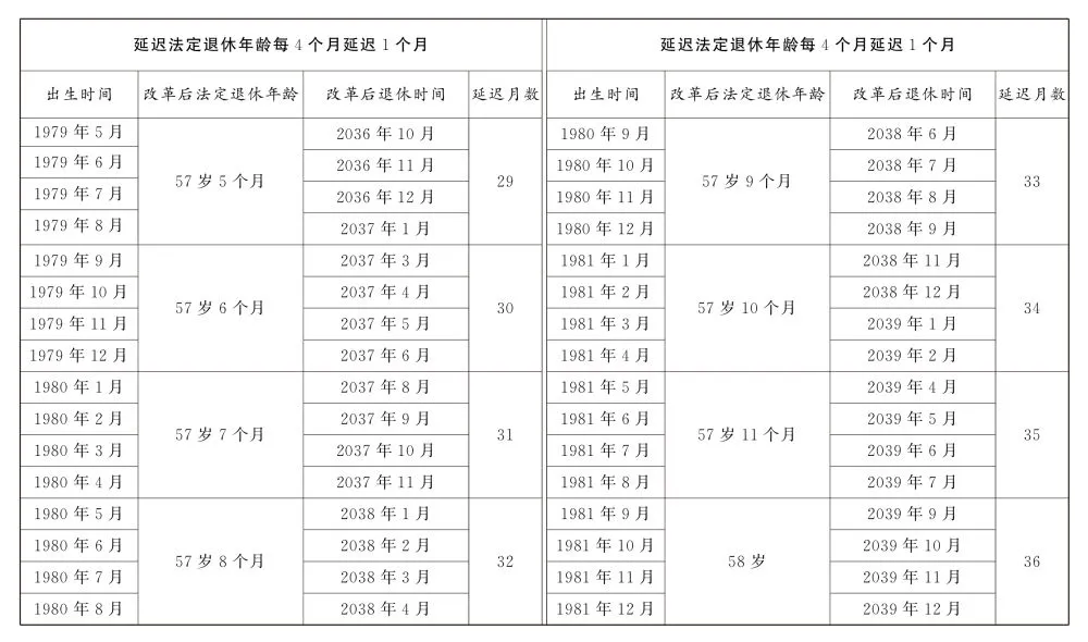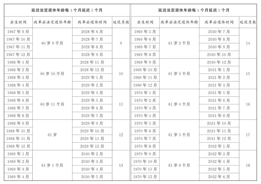 第一條?從2025年1月1日起,男職工和原法定退休年齡為五十五周歲的女職工,法定退休年齡每四個月延遲一個月,分別逐步延遲至六十三周歲和五十八周歲;原法定退休年齡為五十周歲的女職工,法定退休年齡每二個月延遲一個月,逐步延遲至五十五周歲。國家另有規定的,從其規定。